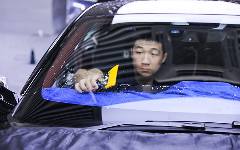 ▲汽车窗膜施工中,车艺尚采用500ML整车微水贴膜,避免电器门板受潮短路等施工伤害。